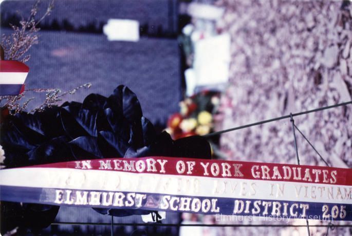 A black wreath placed in memory of the York High School students who had died in the Vietnam War at the Veterans Memorial Moving Wall in Wilder ParkPhotograph Details