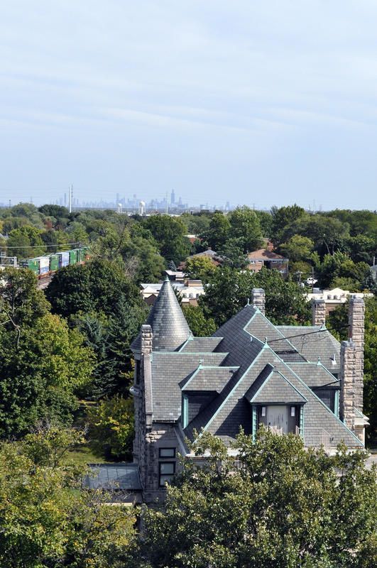 View from the 105 S. York rooftop, looking east past the Glos Mansion.Photograph Details