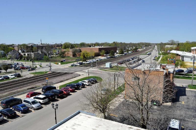 View from parking deck at 175 W. First Street looking southwest towards the Maple Ave Railroad Crossing. Elmhurst College is visible in the background.Photograph Details
