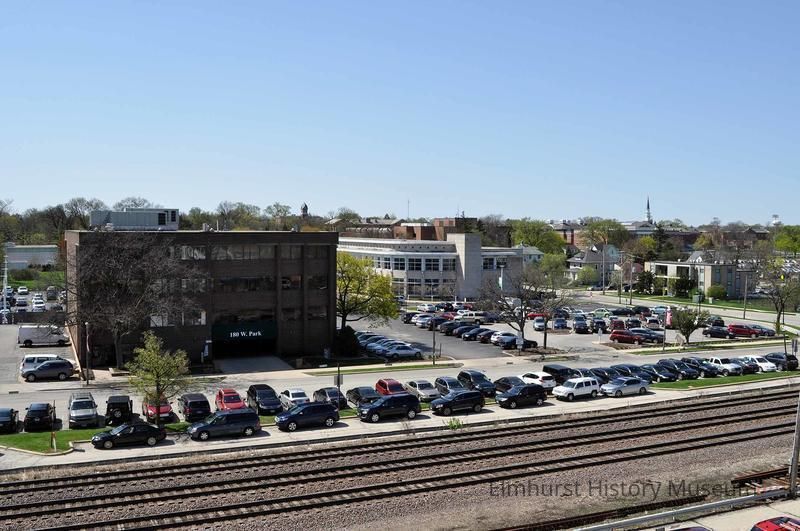 View from parking deck at 175 W. First Street looking south towards the Elmhurst Public Library at 125 S. Prospect. The office building at 180 W. Park is visible at left, and Elmhurst College is visible at right.Made/Created