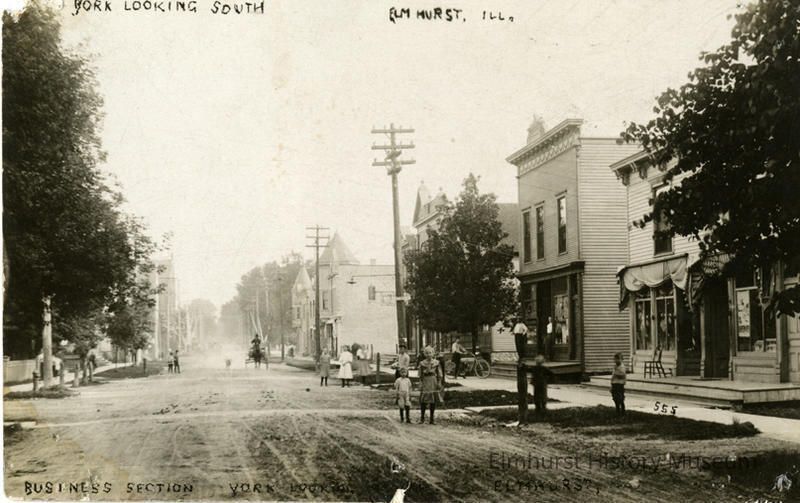 Printed on front: York looking south Elmhurst, Ill. Business section / 555 Handwritten: N. York St. at Schiller Ct. / Hilliard's Plumbing Shop / Fiene's General Store?