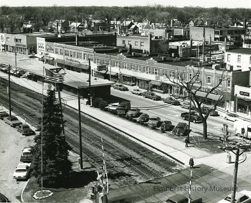A view from the roof of the Elmhurst National Bank building, 105 S. York Street, looking northwest towards W. First Street and the Chicago and North Western Railroad Depot.Photograph Details