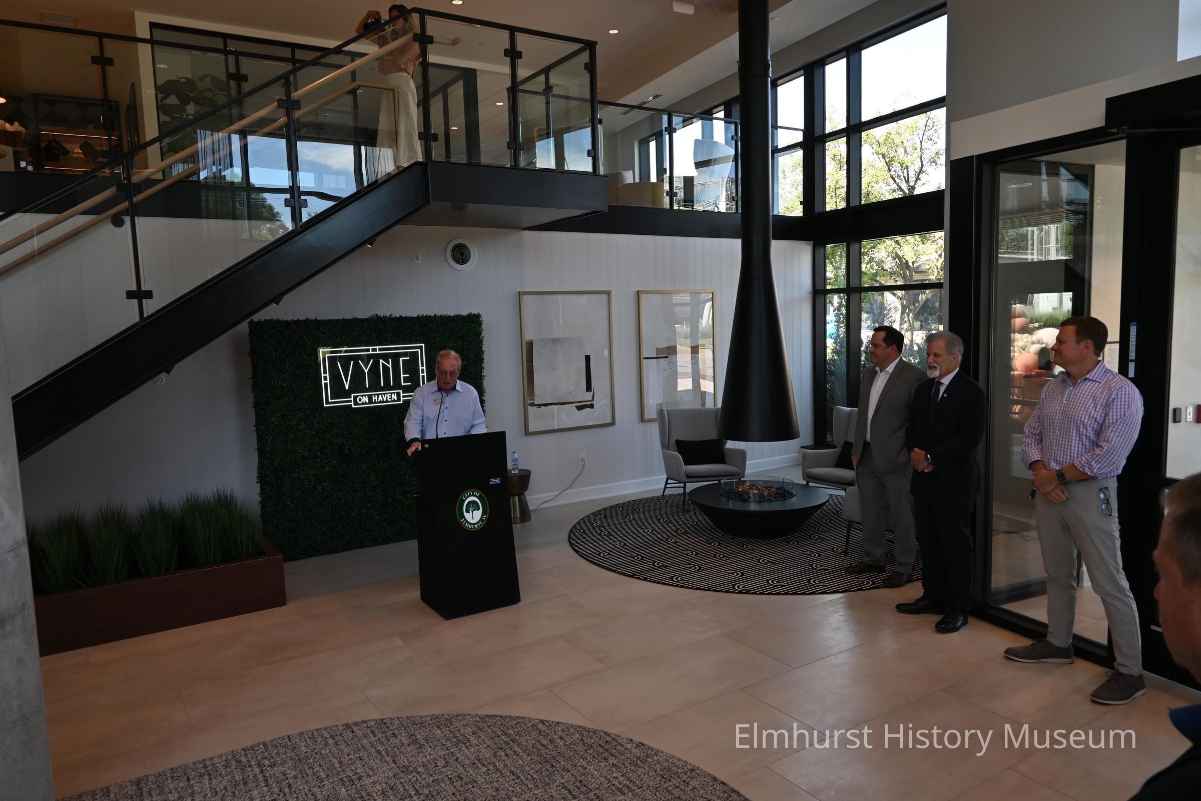 Chamber of Commerce president John Quigley speaks at the ribbon cutting ceremony for the Vyne on Haven apartment block at 100 Haven Road.Photograph Details