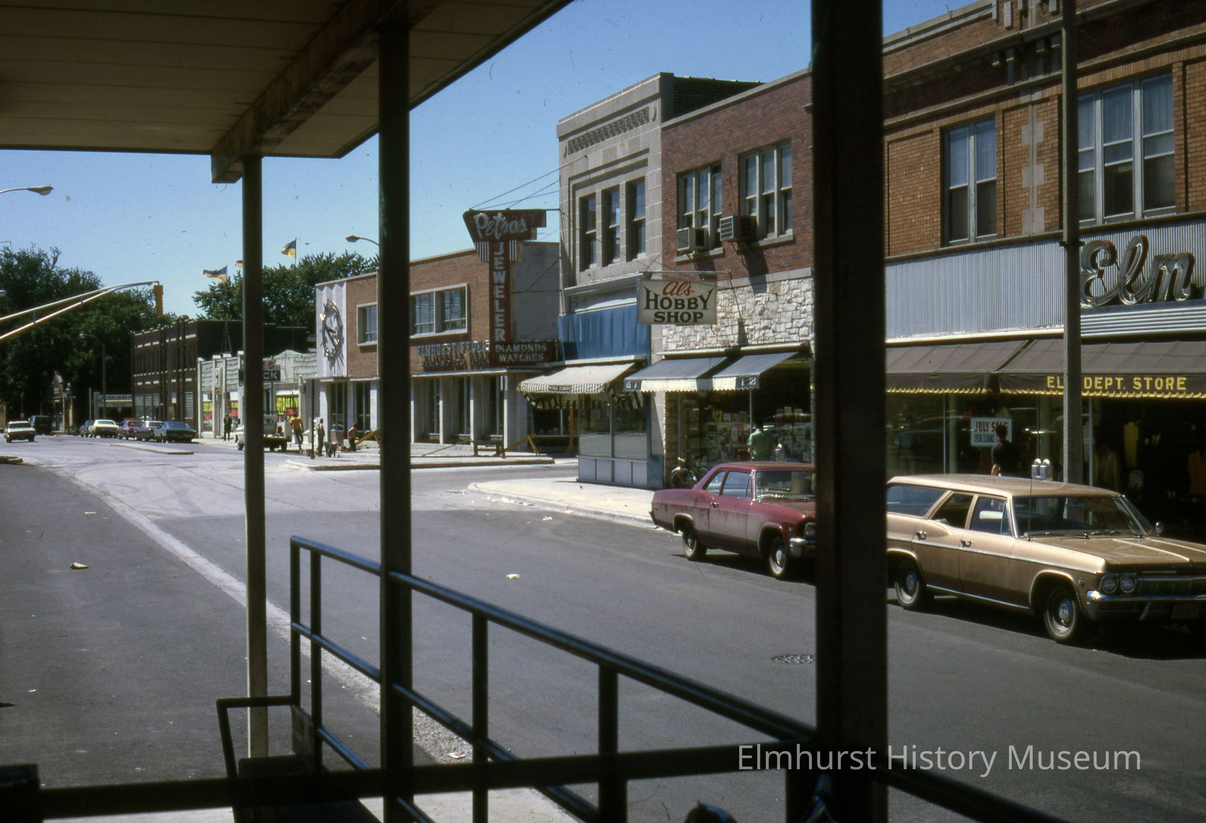 W. First Street looking west from the Chicago & North Western railroad station towards N. Addison Avenue. Al's Hobby Shop at 129 W. First Street and the Elm Department Store are at right.Photograph Details