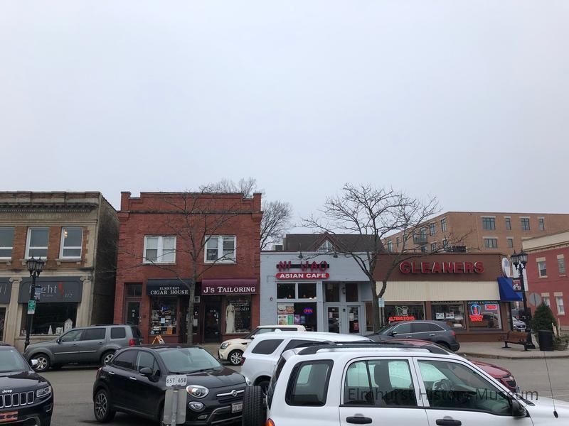 Storefronts on W. Park Avenue, east of Adell Place. Businesses include Zion Cleaners, Ni Hao Asian Cafe, J's Tailoring, Elmhurst Cigar House, and Flight 112 (closed since 2016).Photograph Details