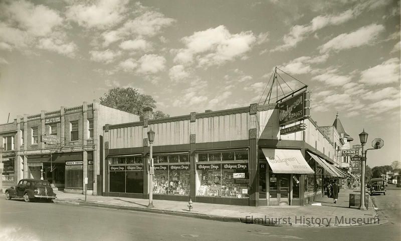 On back: Photo taken by Vernon Hart of Kaufman & Fabry Co., 425 S. Wabash Ave Chicago, Ill. Monday morning Sept. 10th, 1945 / West 1st St. Elmhurst, Ill - 1945 / Left to Right: / 109 Elmhurst Bicycle & Key Shop / 107 Barber Shop - Crum Letter Service (2nd Floor) / 105 Hank's Tavern / 100 N. York St. - Walgreen Drug Store. Photographer credit: Kaufmann & Fabry Co. / Chicago Notation: From Ted Kross 1975