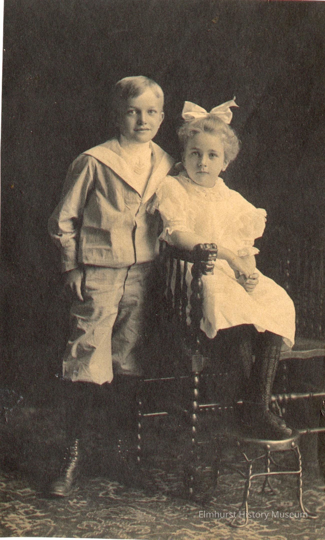 Studio portrait photograph of siblings Walter and Mabelle Glos, children of Emma and Jacob Glos.Photograph Details