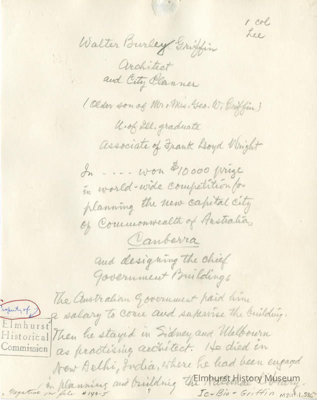 on back: Walter Burley Griffin, Architect and City Planner (older son of Mr. + Mrs. Geo. W. Griffin) U. of Ill. Graduate Associate of Frank Lloyd Wright (includes story about Griffin traveling to Australia)