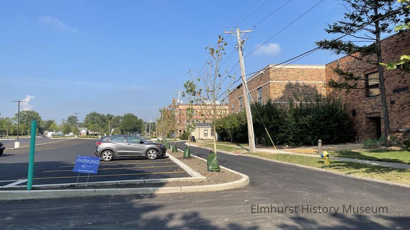Walter Street western terminus at the Alexander Street parking lot following a construction project that shortened the street on the Elmhurst University Campus, looking west.Photograph Details
