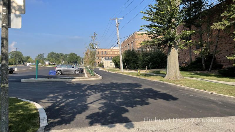 Walter Street western terminus at the Alexander Street parking lot following a construction project that shortened the street on the Elmhurst University Campus, looking west.Photograph Details