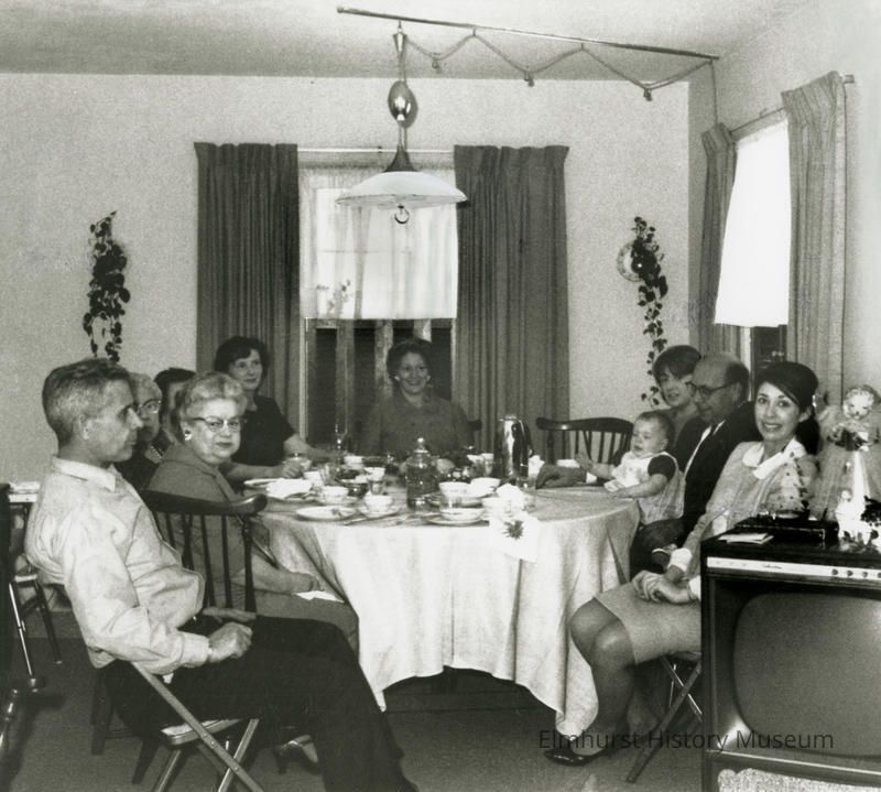 Typed on paper affixed to back: Identification for the photograph of the Warner/Elliott family (m96-32): Starting at the left: Hubert Elliott, Margaret Kloehr, Etta (sister of Margaret Kloehr), Rose Kloehr, Elizabeth Warner, Idella Elliott, Susan Elliott holding Deborah Warner, Bill Kloehr, and Barbara Elliott. The photo was taken at the Hubert Elliott home at 980 Spring Road at Christmas c. 1968 Negative 4579-5