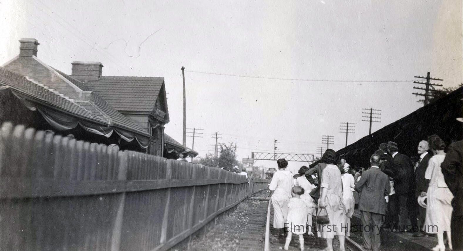 A crowd gathers around the Chicago & North Western railroad depot in downtown Elmhurst to view the President Warren Harding funeral train.Photograph Details