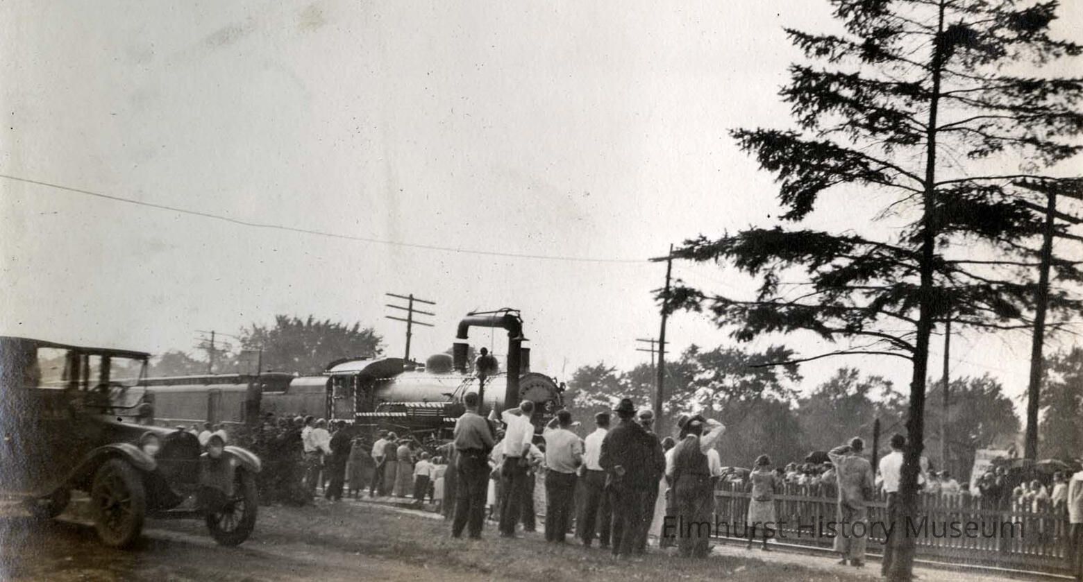 A crowd gathers around the Chicago & North Western railroad depot in downtown Elmhurst to view the President Warren Harding funeral train.Photograph Details
