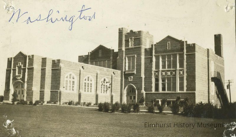 Typed caption "WASHINGTON SCHOOL" is taped to bottom of the image. Written on upper left front in blue ink is "Washington." The name is also written on the back and typed in black on lower front. Negative number is also noted.