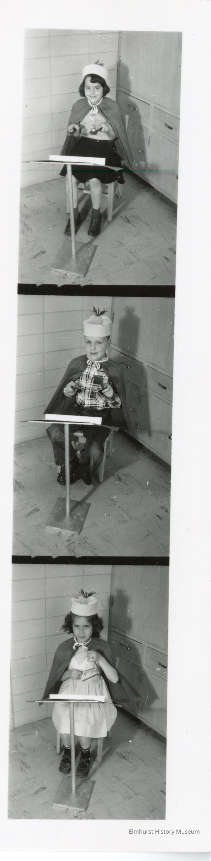 Photograph triptych of Washington School students Kathy Bard, Byron Guyer, and Joy Overbeck in their rhythm band outfits.Photograph Details