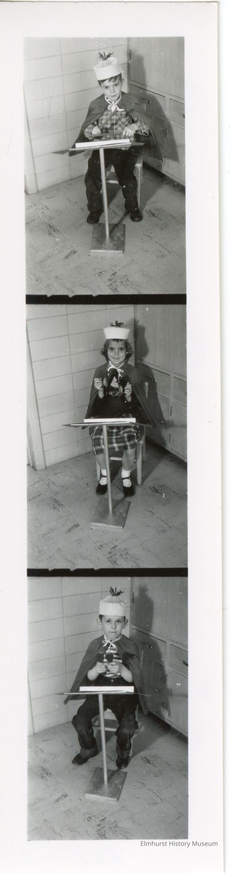 Photograph triptych of Washington School students Chuck Houck, Candy Candrian, and Lee Stecher in their rhythm band outfits.Photograph Details