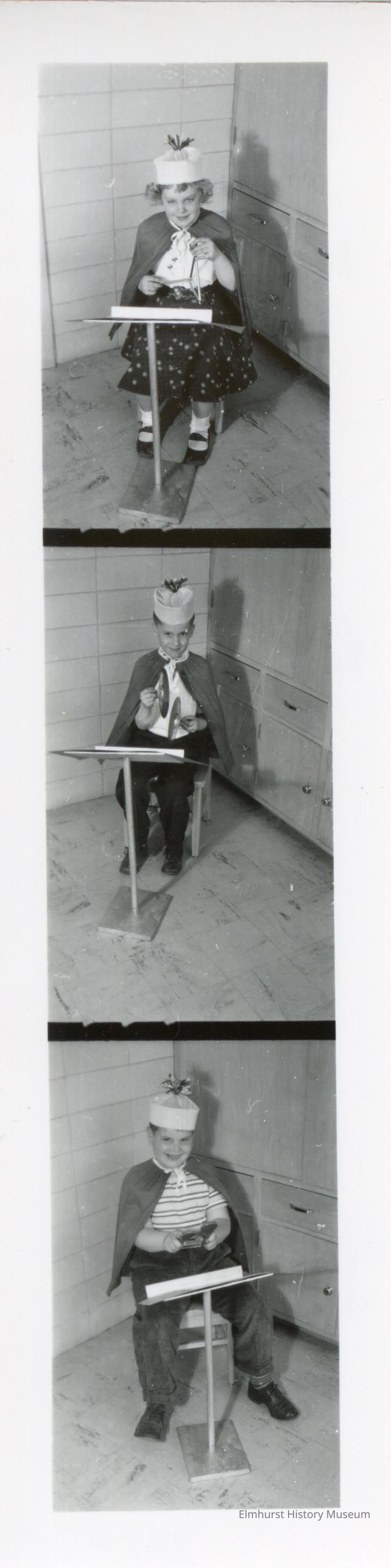 Photograph triptych of Washington School students Linda North, Eddie Pappert, and Dean Larson in their rhythm band outfits.Photograph Details