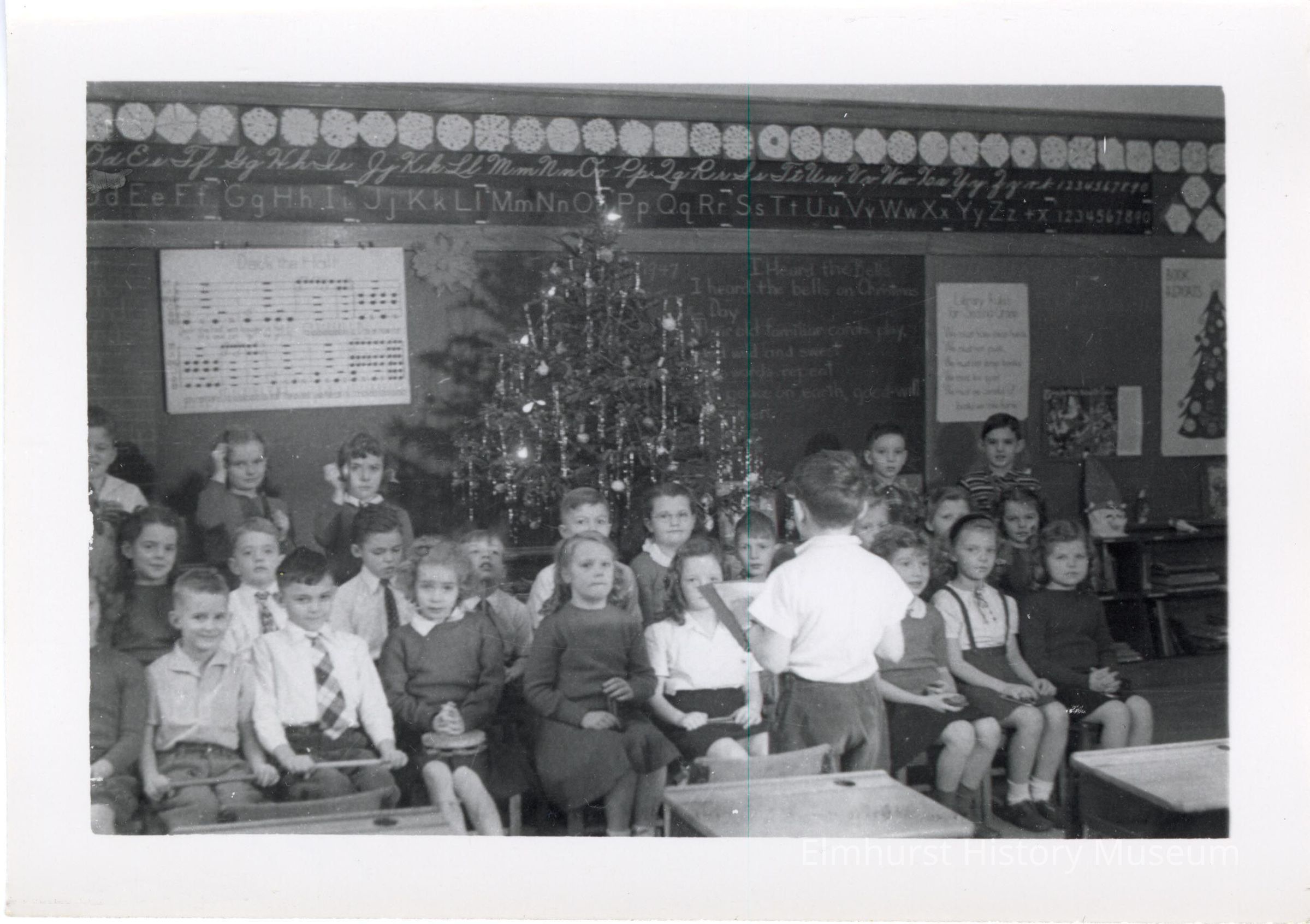 Students in a classroom at Washington Elementary School. A Christmas tree is in the background.Photograph Details