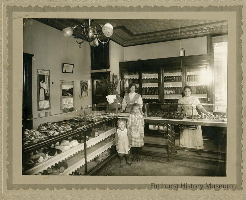 nterior view of Weber's Bakery, 112 N. York Street. Children: Edna and Edward Weber; adults left to right: Martha Klein and Hermina Klein Weber.