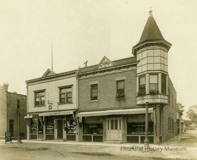 Elmhurst Fruit Store at 110 N. York Street and Weber's Bakery at 112 N. York Street, facing southwest. Photo credit reads "Paessler Studio, Elmhurst."Photograph Details