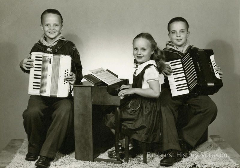 Ed and Marion Wegener's children, left to right: Bill, Carol, and Guy Wegener, posing with musical instrumentsPhotograph Details