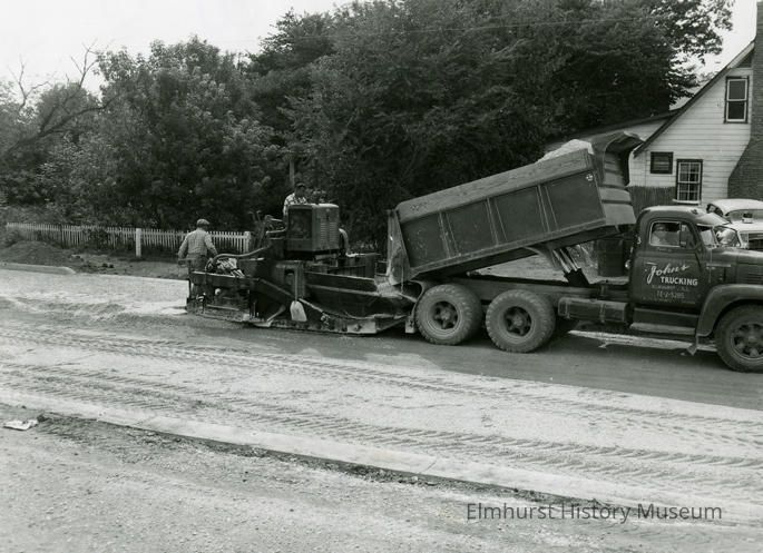 Written on back: Truck dumping crushed stone into Barber Greene machine, layi in the base on N. West Avenue.