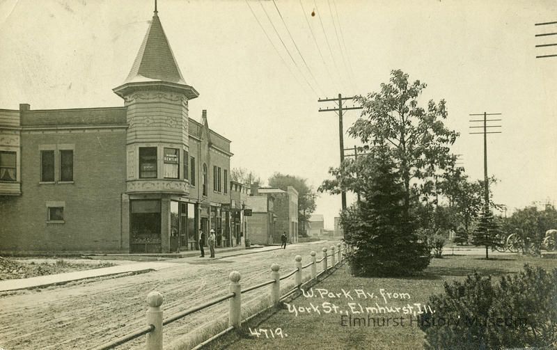 West Park Avenue looking west. There is a message from Rex to Mr. Allen Wehrli in St. Louis, MO. It is postmarked from Elmhurst in 1916. Postcard bears a one-cent stamp.Photograph Details