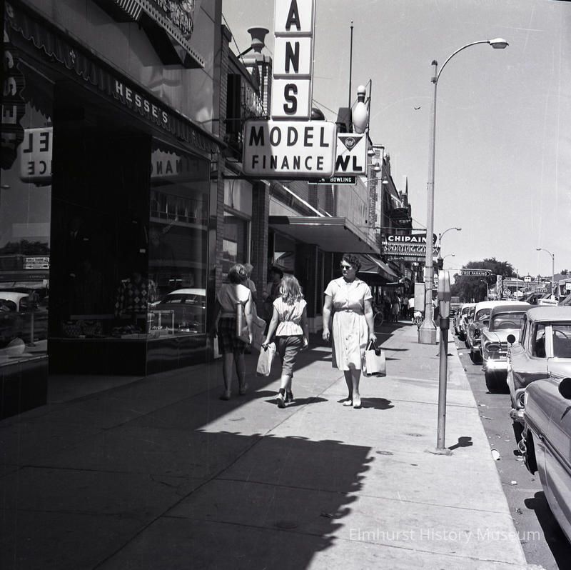 West Side of N.York Street, looking north. Visible businesses include Chipain's Sporting Goods, Hesse's, and Elm Bowl.Photograph Details