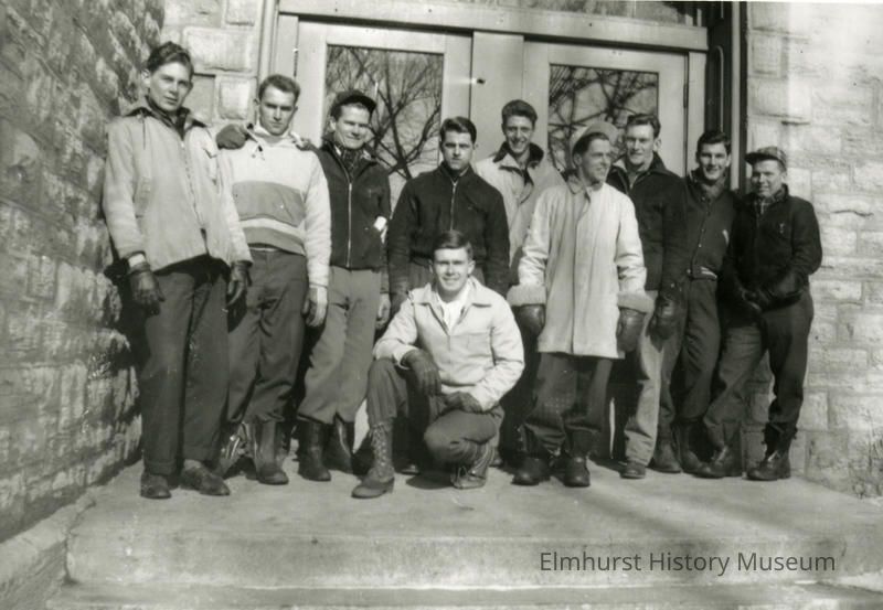 Members of the White Eagle Squadron of the Navy Air Corps. Kneeling in front-Aubert Ruth of Downers Grove; standing left to right: Les Boldebuck of Elmhurst, Reinhardt Marshall of Lombard, Allen Fairbanks of West Chicago, unidentified, Harrison Coryell, Jim Dyer of Downers Grove; Ray Vertovec of Elmhurst and Owen DeMars of Elmhurst. At pre-flight school at Wheaton College.Photograph Details