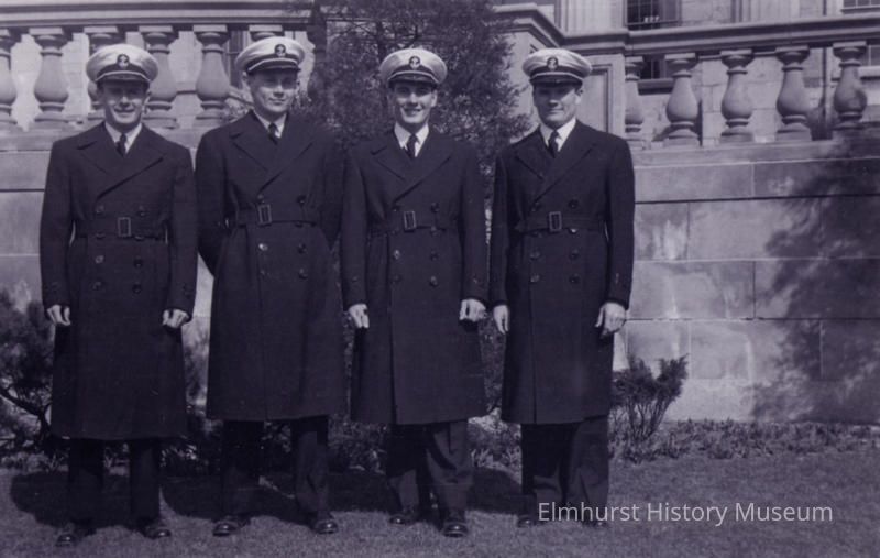 Four members of the White Eagle Squadron of the Naval Air Corps in their trench coats. Left to right : Aubert Ruth of Downers Grove, Les Boldebuck of Elmhurst, Raymond Vertovec of Elmhurst and Al Fairbanks of West Chicago. During flight training in Iowa City, Iowa.Photograph Details