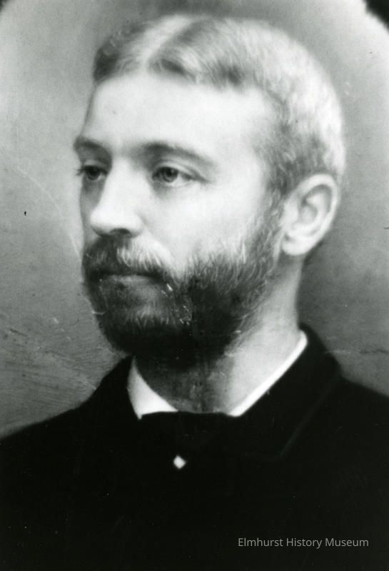 on back: Came to Cottage Hill at age of 6- with family in 1857 contributions to Elmhurst: one of founders of Elmhurst Electric Light Co. and Elmhurst Spring Water Co. subdivided Hagans additions Purchased right of way for Chicago, Aurora Elgin RR Letters in Historical Museum source of valuable material on early Elmhurst