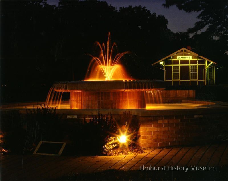Illuminated Bicentennial Fountain and Chicago Great Western Depot at night, Wild Meadows Trace, 511 S. York StreetPhotograph Details
