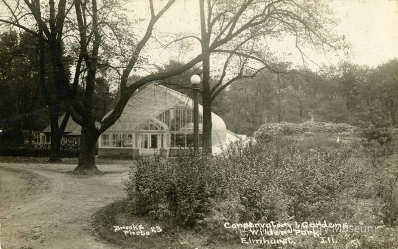 Wilder Park Conservatory and the gardens. This view shows the west façade of the conservatory. Printed in white on the front "Brooks Photo 23. Conservatory & Gardens, Wilder Park, Elmhurst, Ill." Card is postmarkeds "Chicago May 12 1927 1 PM" and bears a cancelled red 2-cent stamp. Messagereads, "Dear Laura, I am spending a fine day with my mother...Love, Mary." Card is addressed to "Mrs. H.L. McCallum / 1607 Tangerine Ave. / St. Petersburg Florida." Publisher is Brooks Photo Postcard.Photograph Details