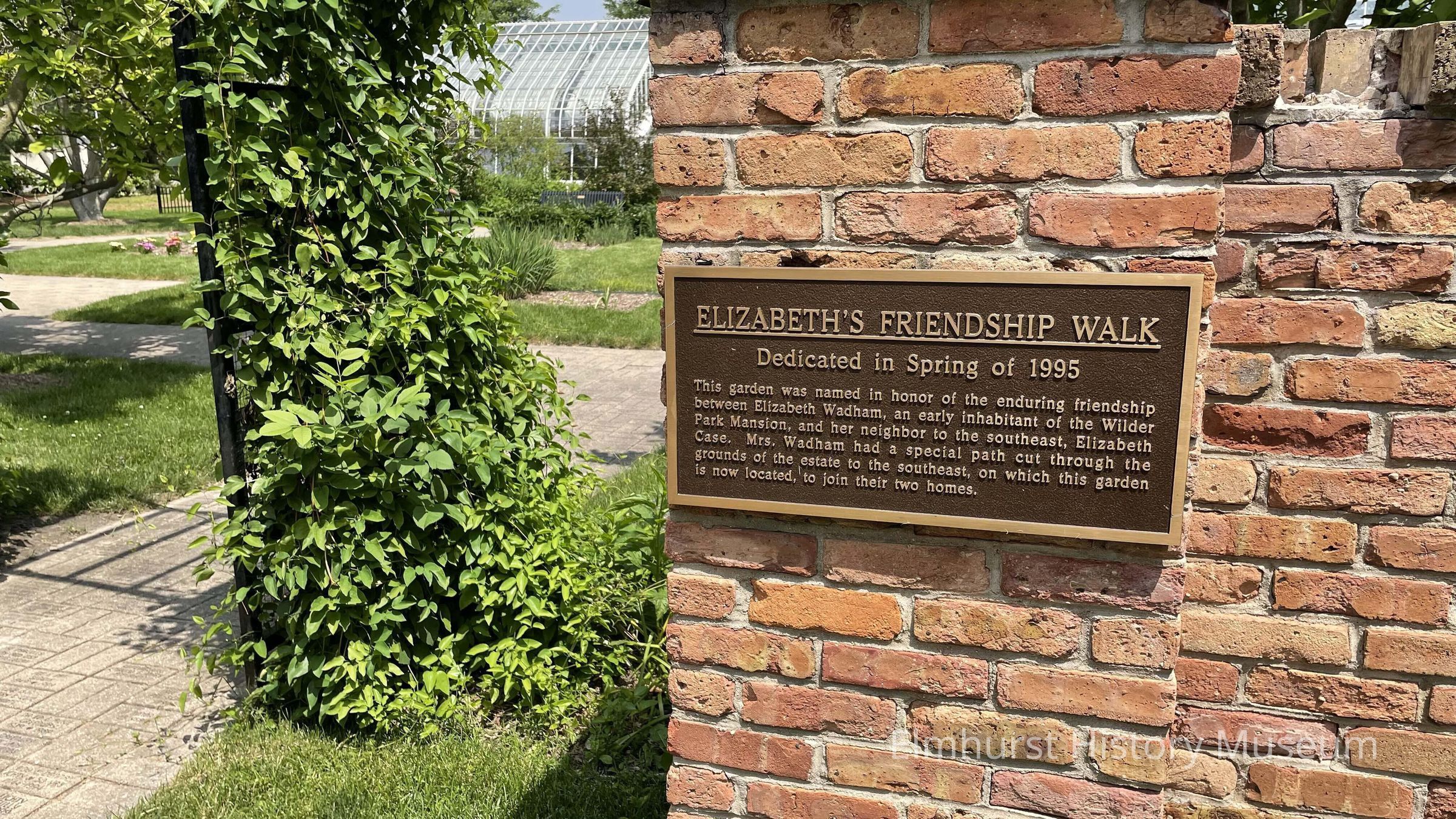 "Elizabeth's Friendship Walk" dedication plaque at the gardens on the south end of Wilder Park.Photograph Details
