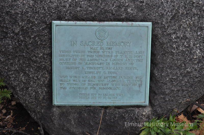 The plaque reads: IN SACRED MEMORY/MAY 30, 1927/ THESE THREE TREES WERE PLANTED AND/DEDICATED BY THE MEMBERS OF T.H.B. POST/NO. 187 OF THE AMERICAN LEGION AND THE/CITIZENS OF ELMHURST IN MEMORY OF/ERNEST H. TIMROTT, RICHARD HINTZ/KINGSLEY(sic) C. BUCK/WHO WERE KILLED IN ACTION DURING THE/ GREAT WAR OF 1914 - 1918. ALSO A TRIBUTE/TO THOSE OF ELMHURST WHO SERVED IN/THE STRUGGLE FOR DEMONCRACY./ THEIRS NOT TO REASON WHY/THEIRS BUT TO DO OR DIE/TENNYSON Side two reads: FOR GOD, COUNTRY/AND THE MEMORY OF/THOSE WHO GAVE THEIR LIVES/IN FREEDOM'S NAME/T.H.B. POST 187/AMERICAN LEGION/REDEDICATES IT'S (sic) EFFORTS./ MAY 30, 1977