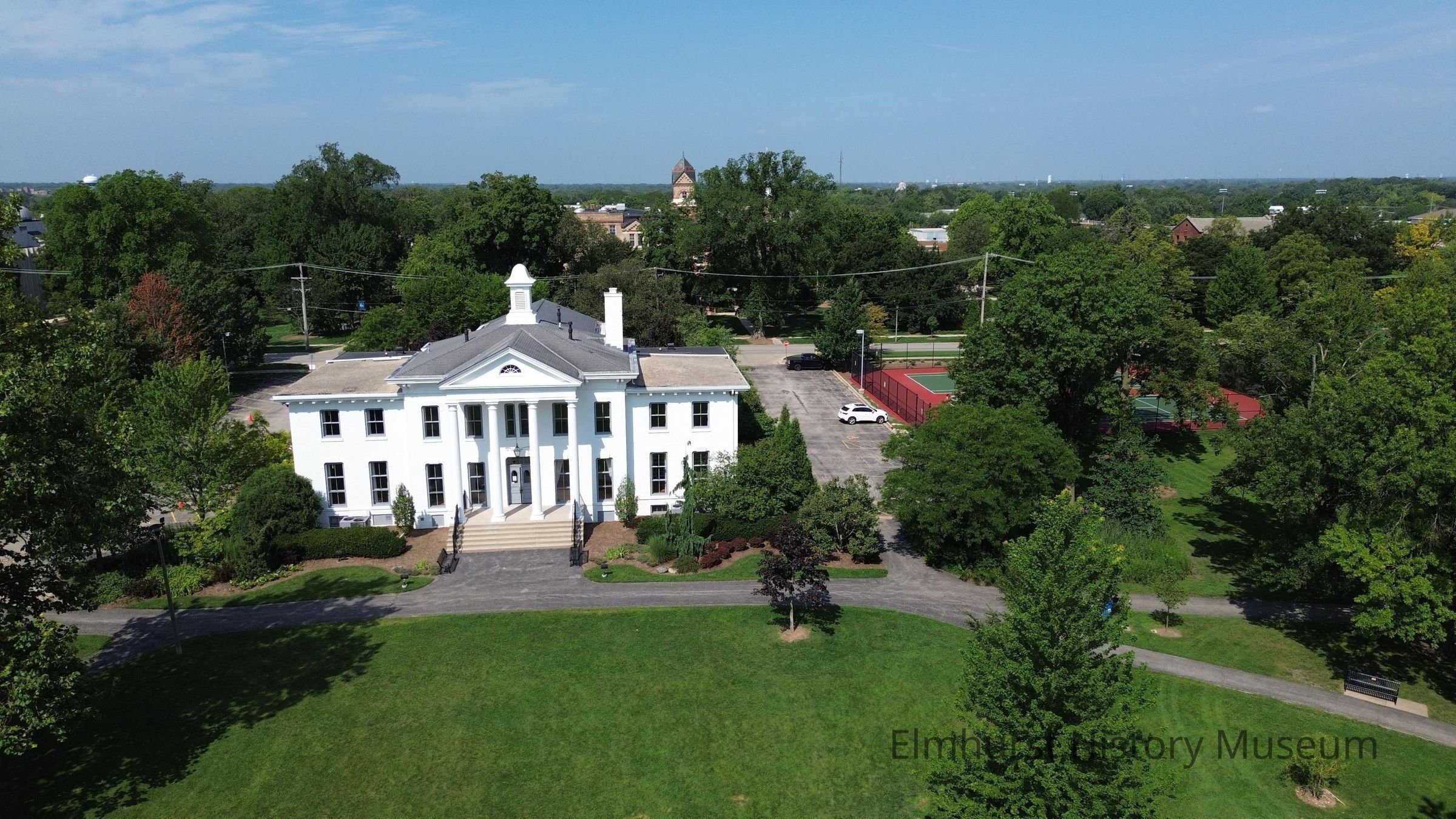 Aerial view of the east façade of the Wilder Mansion, looking west. Newly refinished tennis courts in Wilder Park are at right.Photograph Details