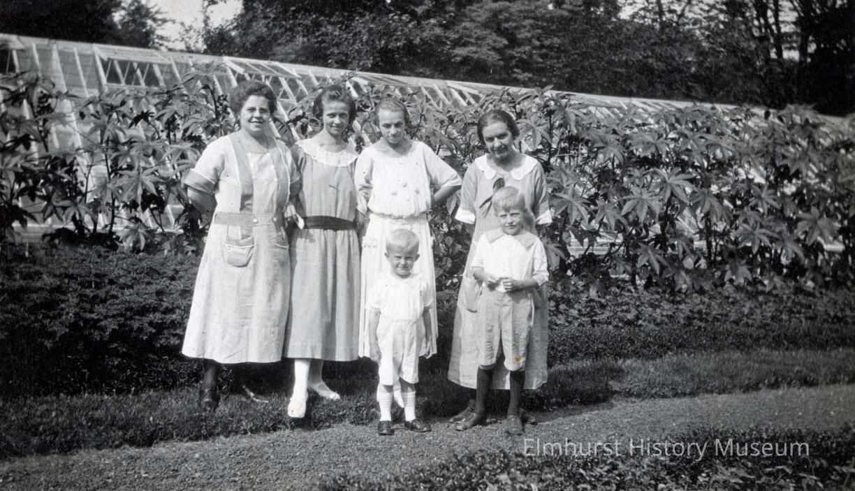 Four women and two children pose in front of a greenhouse.Photograph Details