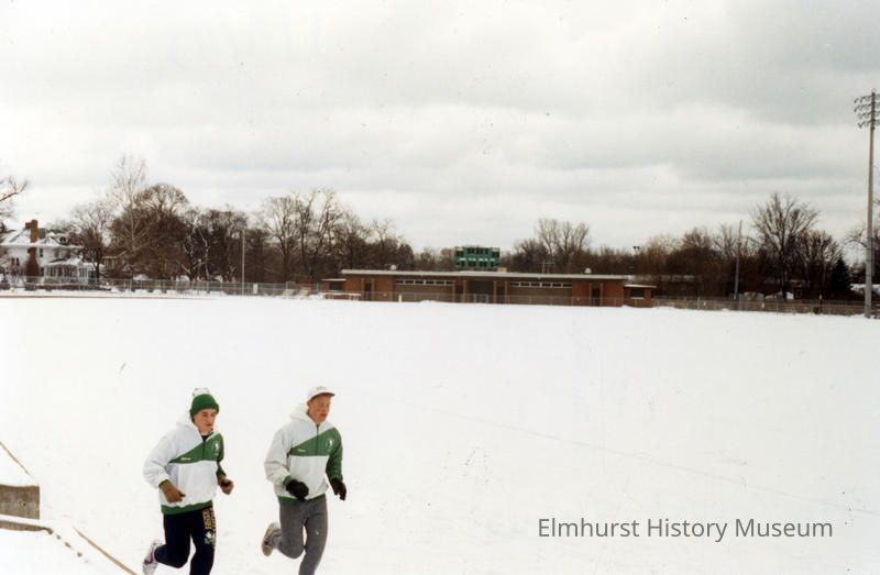 Two students run in the snow on the track around the York Community High School athletic field.Photograph Details