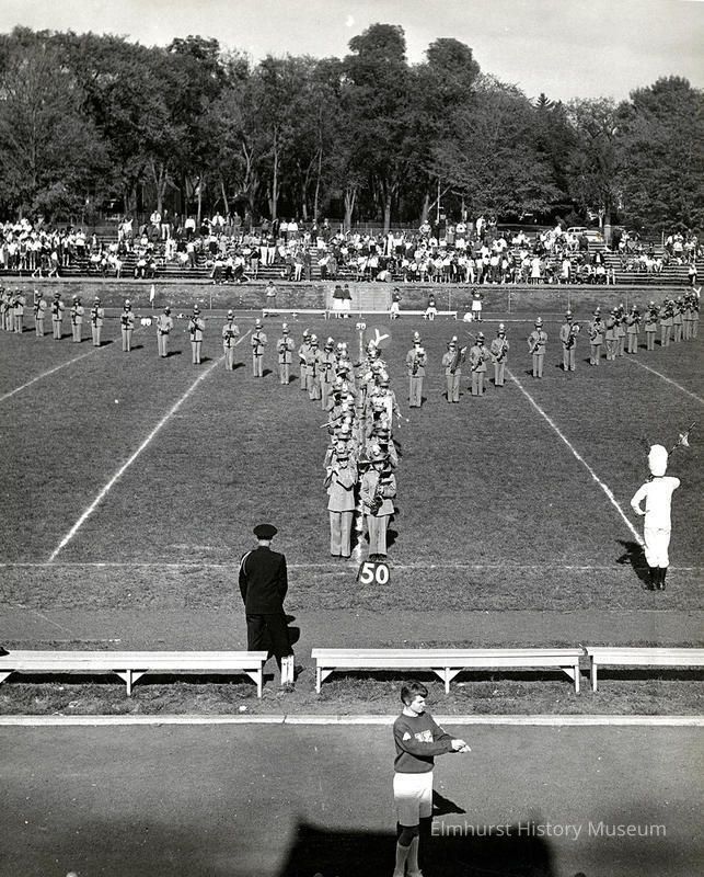 York Community High School marching band on the athletic field.