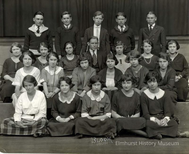 Photography Club, York High School, 1923 Top Row: Oscar Schaeffer, Harold ______ , George Hanson, Harold Miller, Carl Balsemann 3rd row - Esther Graue, Margaret Franzen, Doris Nordling, Art Heine, Emily Downing, Lucille Hammerschmidt, Ella Graue. 2nd row - Edna Overkemp, Marth Quinn, Evelyn Hultquist, Ruth Pearn, Marion Smith, Margaret Hanson Front row: Lucille Strand, Geraldine Stone, Bessie (illegible), Marion ______ , Esther Pfund Identified by Ruth Strand. Photo appeared in the 1923 York yearbook.
