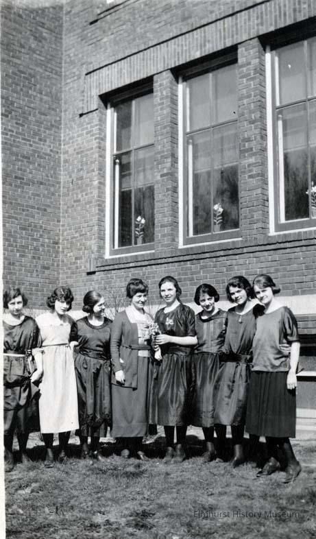 Evelyn Hultquist, Florence ______ , Doris Nordling, Mrs. Crann, Blossom Leveike, Elizabeth Armstrong, Ethel Bosworth, Lona Little. Identified by Ruth Strand in 1980.