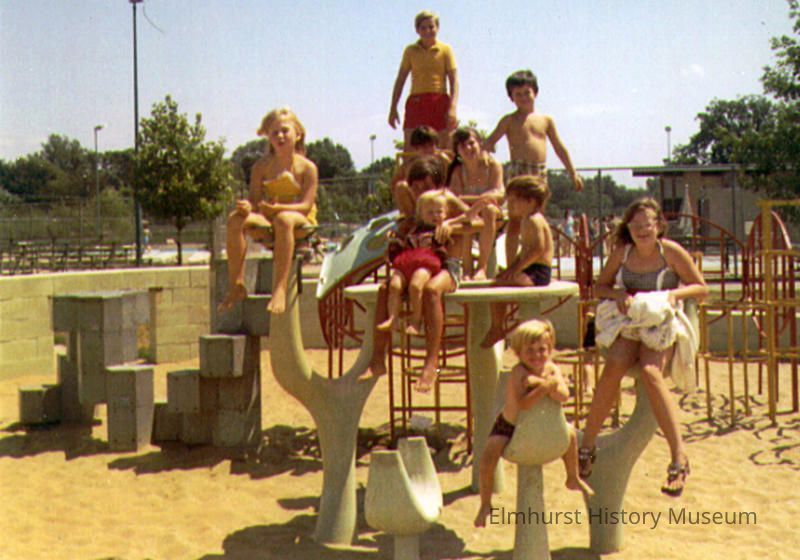 Children on playground equipment at York Commons at 665 S York Street. The swimming pool is in the background.Photograph Details