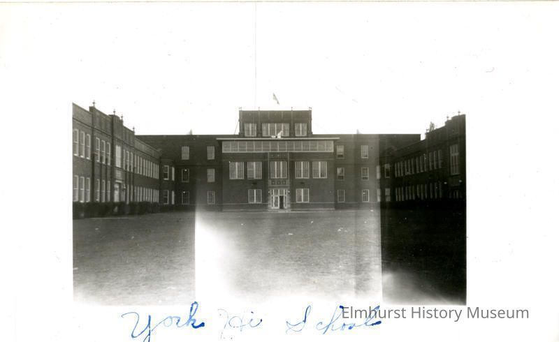 Main entrance of York Community High School. "York Hi School" is written in blue ink on the photograph.