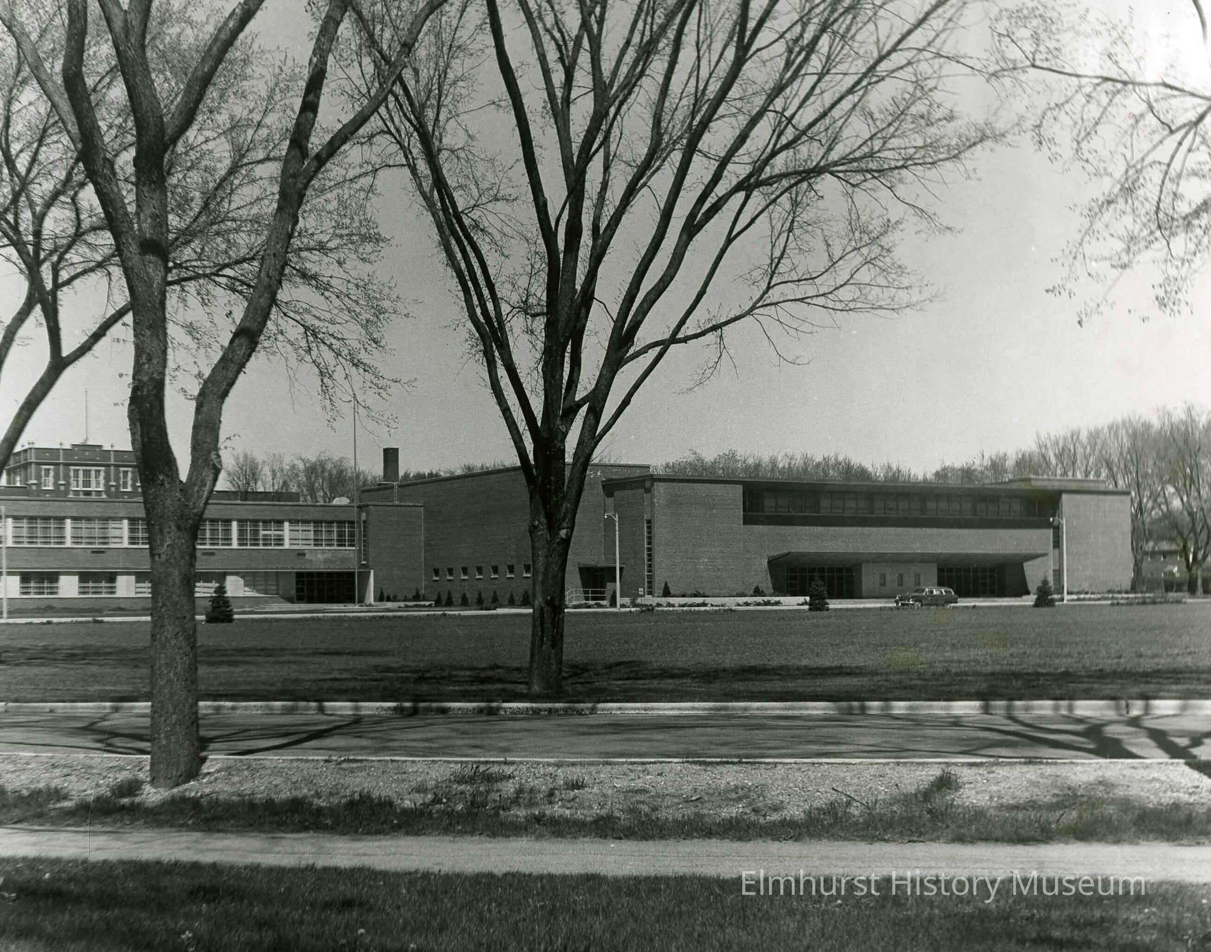 On back: Elmhurst - York community H. S. / copy 1 / South view showing addition - 1957 / R. ? Stamped on back: Elmhurst Public Library / Elmhurst, IL 60126