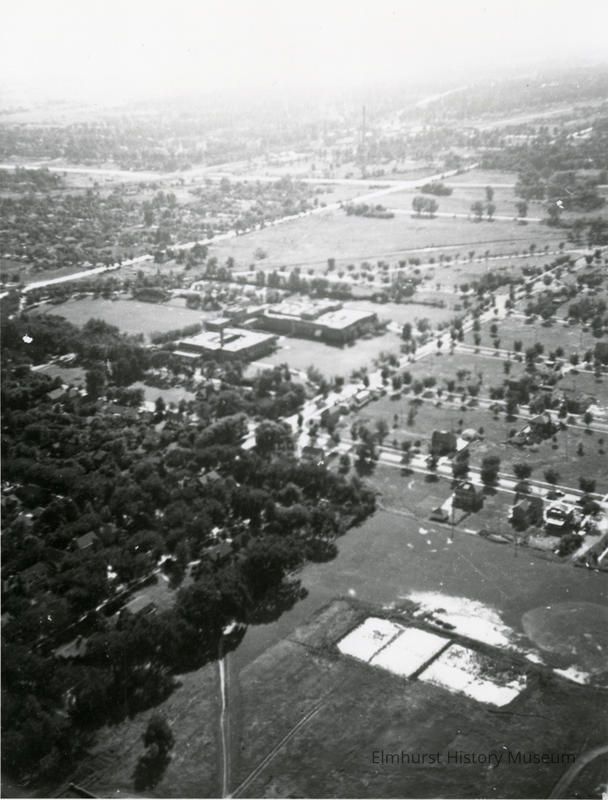 Aerial view of York Community High School and the surrounding area. Image has school building in the center with oval athletic field to the left. Bottom half of photo is filled with wooded area on left and fields or large areas without foliage on the right. Residential lot grids surround the school. Houses are interspersed among empty lots.Photograph Details