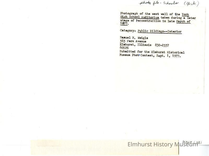 Photograph of the west wall of the York High School Auditorium taken during later stage of reconstruction in late March of 1977. Category: Public Buildings - Interior Samuel N. Weigle 565 Fern Avenue Elmhurst, IL 60126 Submitted for the Elmhurst Historical Museum Photo Contest. Sept 1, 1977.