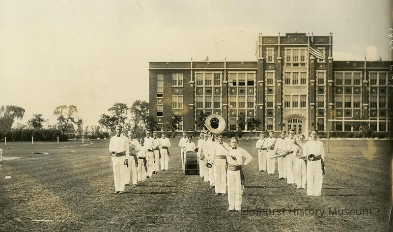 York Community High School band in formation on the lawn in front of the school building, looking north.Photograph Details