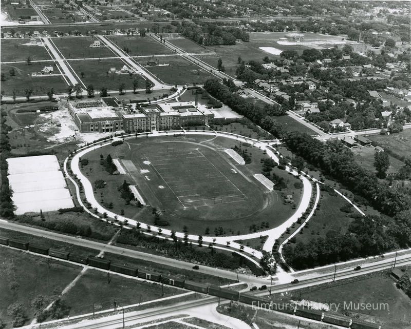 Aerial view of York Community High School and its football field. St. Charles Road is in the forefront. The photographer was looking to the northeast.Photograph Details