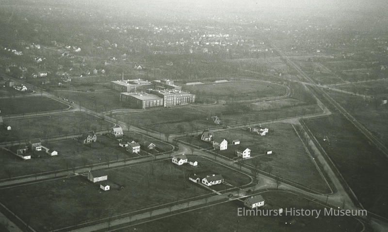 An aerial view of York Community High School and the surrounding area, looking southeast. College View Terrace Subdivision is on the left.Photograph Details