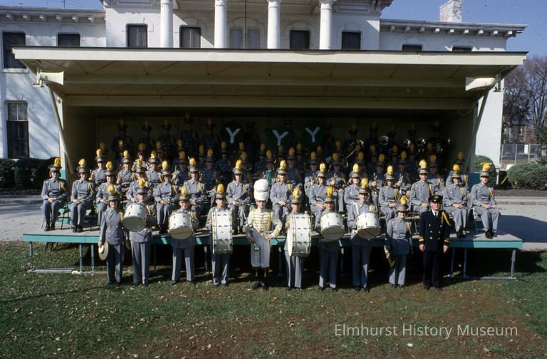 YCHS Marching Band posing for a group portrait in front of the Elmhurst Public Library in the Wilder Mansion.Photograph Details